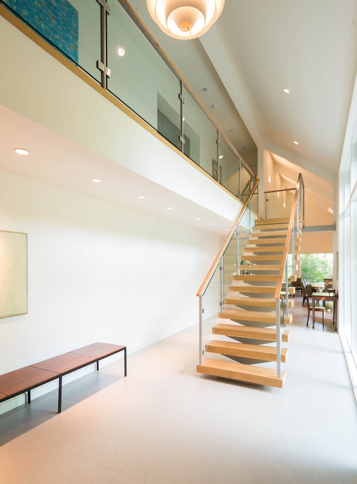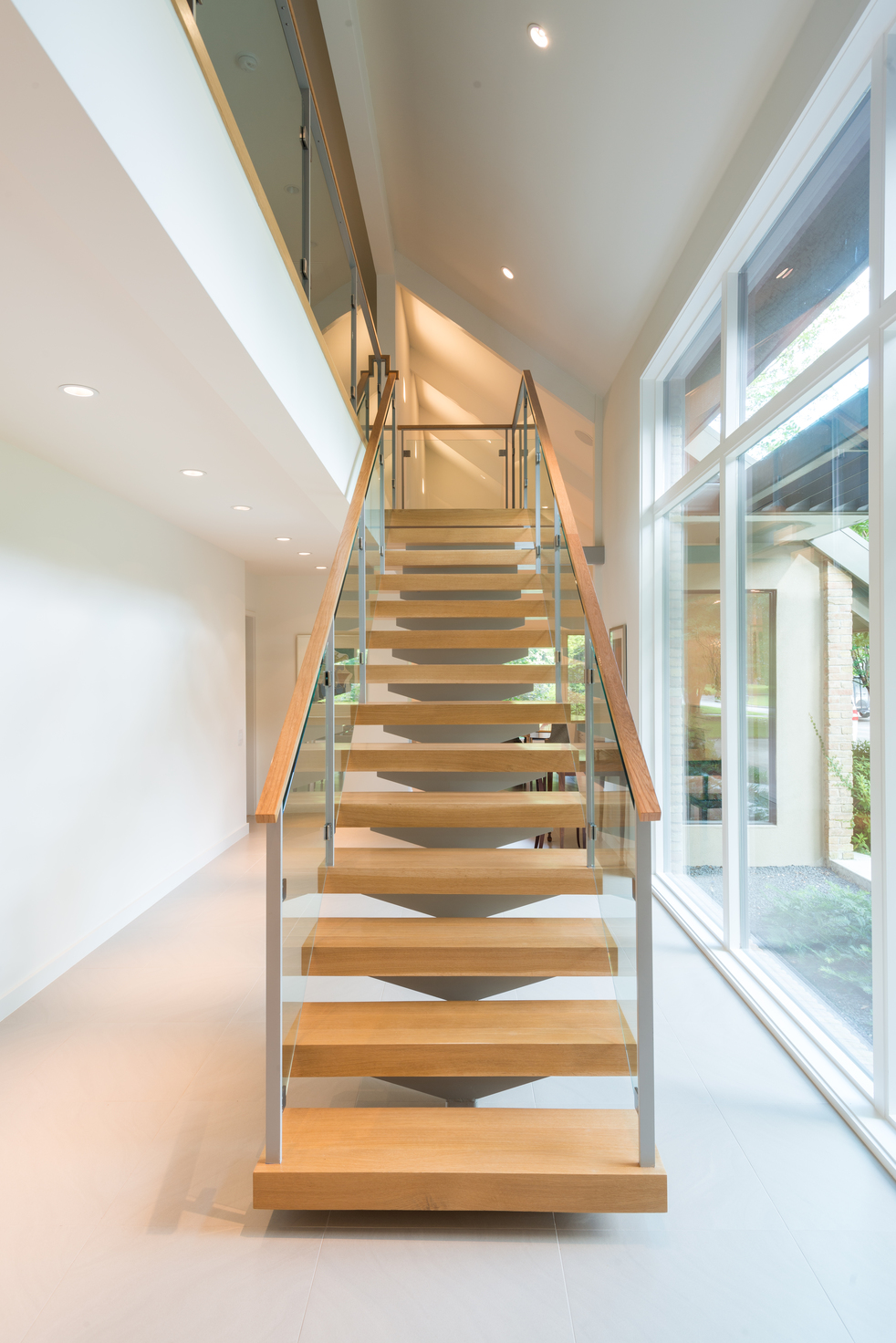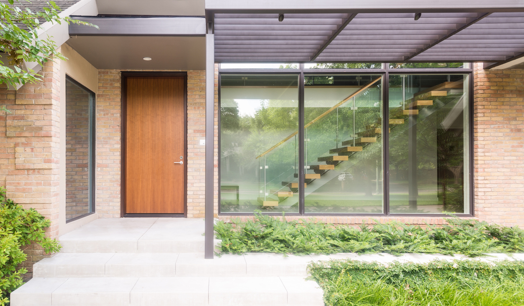 The owner wanted to renovate and open up the front area with more natural light and cleaner lines. We removed a bulky stairs and introduced a light contemporary stair which can be seen from the street. Along with adding a new entry and a metal canopy.